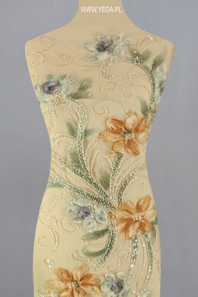 Verzierte Spitze von hoher Qualität, die sich durch originelles Muster und dekorative Details auszeichnet. Geschaffen mit dem Gedanken an anspruchsvollste Frauen, die auf eine einmalige und effektvolle Stilisierung Wert legen. Die vorgestellte Spitze wird sich als Basis einer Hochzeits- oder Abendkreation bewähren. Ihre Schönheit verdankt sie den darin enthaltenen Details. Sie spiegeln das Licht wider und erhellen den Stoff, wodurch sie zum Hingucker werden.
