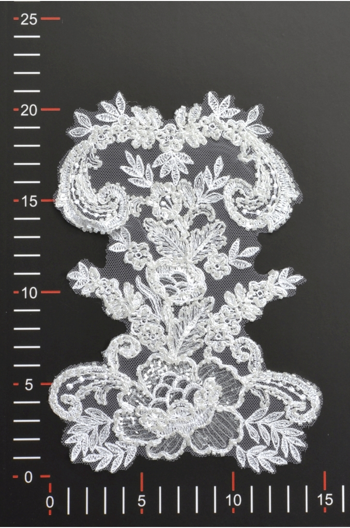 Die Applikation ist dekoriert und besteht aus eleganter Spitze und einzigartigen Accessoires, die den Aufnäher aufhellen. Das gesamte Design des Produkts ermöglicht es Ihnen, es als einzigartiges dekoratives Element in einem Abend-, Cocktail- oder Hochzeitskleid zu verwenden.