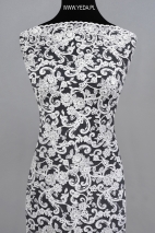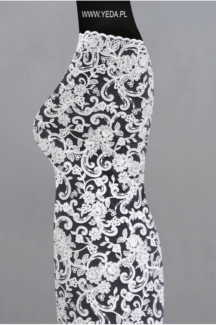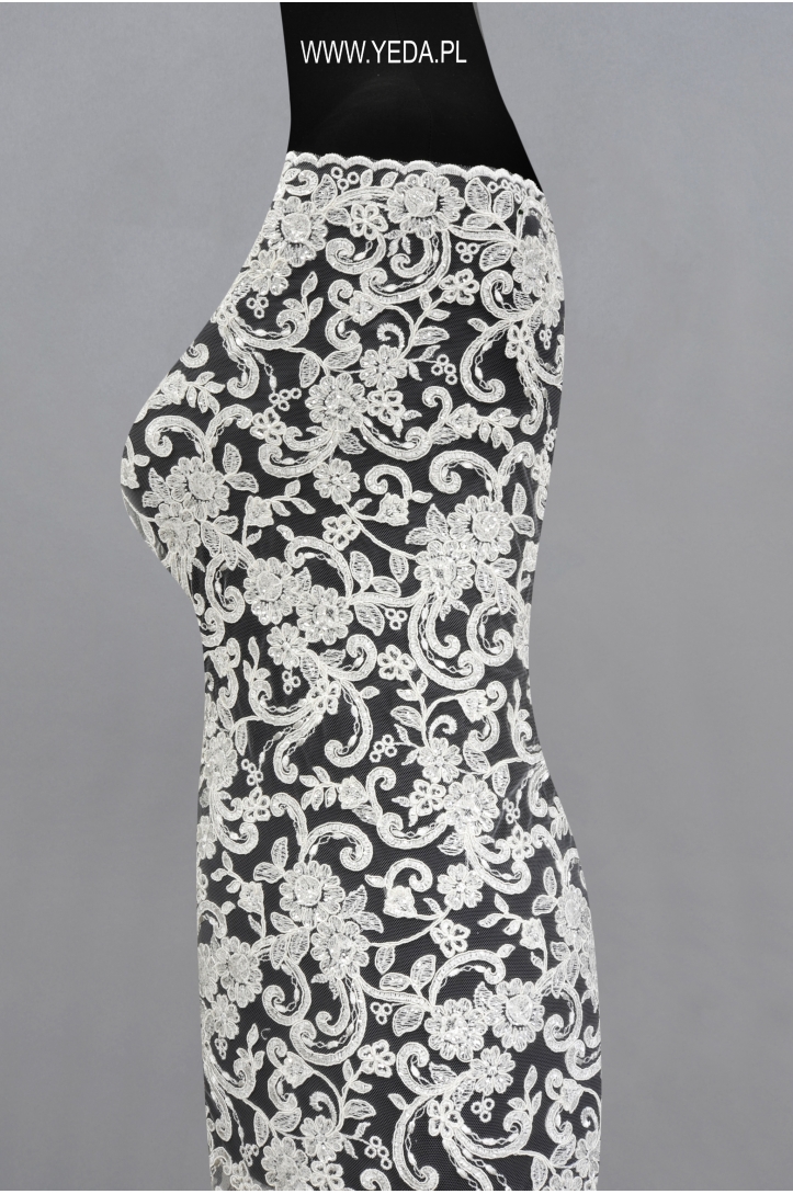Verzierte Spitze von hoher Qualität, die sich durch originelles Muster und dekorative Details auszeichnet. Geschaffen mit dem Gedanken an anspruchsvollste Frauen, die auf eine einmalige und effektvolle Stilisierung Wert legen. Die vorgestellte Spitze wird sich als Basis einer Hochzeits- oder Abendkreation bewähren. Ihre Schönheit verdankt sie den darin enthaltenen Details. Sie spiegeln das Licht wider und erhellen den Stoff, wodurch sie zum Hingucker werden.
