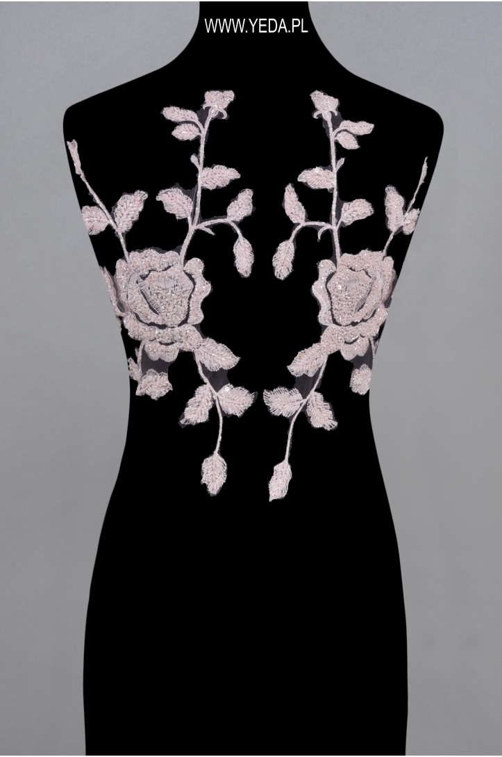 Die Applikation ist dekoriert und besteht aus eleganter Spitze und einzigartigen Accessoires, die den Aufnäher aufhellen. Das gesamte Design des Produkts ermöglicht es Ihnen, es als einzigartiges dekoratives Element in einem Abend-, Cocktail- oder Hochzeitskleid zu verwenden.