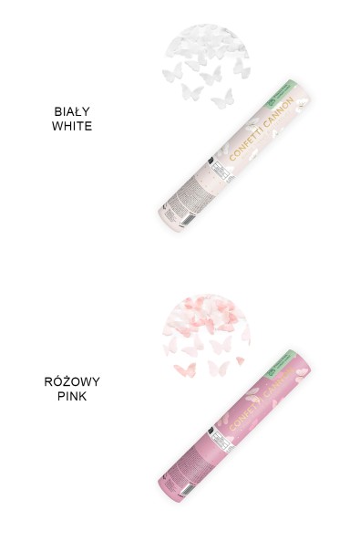 Konfettikanone mit Papier-Schmetterlingen, in zwei Farben erhältlich. Rohrlänge 20 cm. Die Kanone funktioniert mit Druckluft und ist kein Feuerwerkskörper. Schussweite: 5–8 m.