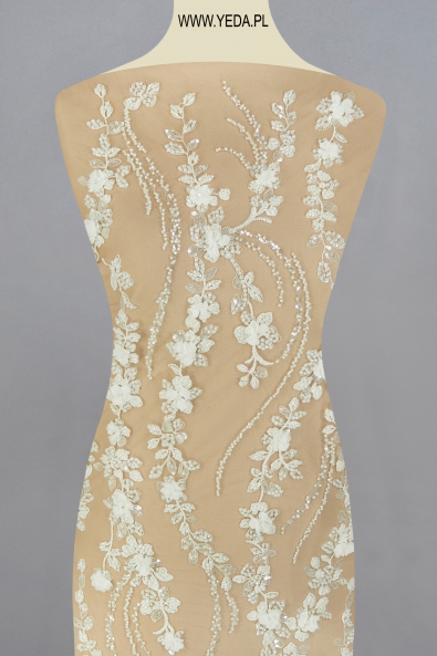 Hochwertig dekorierte Abendspitze für Frauen, die Wert auf Eleganz legen. Das einzigartige Muster wurde auf Tüll gestickt und anschließend mit spektakulären Details verziert. Diese Art von Material fällt auf und verleiht dem Benutzer einen verführerischen Charakter. Diese Art von Spitze ist die Basis eines klassischen Abend- oder Cocktailkleides.