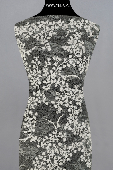 Verzierte Spitze von hoher Qualität, die sich durch originelles Muster und dekorative Details auszeichnet. Geschaffen mit dem Gedanken an anspruchsvollste Frauen, die auf eine einmalige und effektvolle Stilisierung Wert legen. Die vorgestellte Spitze wird sich als Basis einer Hochzeits- oder Abendkreation bewähren. Ihre Schönheit verdankt sie den darin enthaltenen Details. Sie spiegeln das Licht wider und erhellen den Stoff, wodurch sie zum Hingucker werden.