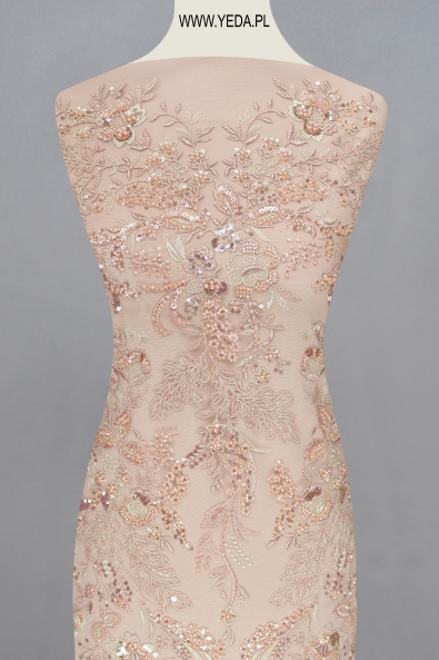 High-quality decorated evening lace created for women who value elegance. The unique pattern was embroidered on tulle and then decorated with spectacular details. This type of material catches the eye and gives the user a seductive character. Such lace is the basis of a classic evening or cocktail dress.