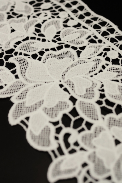 The highest quality undecorated trim made of guipure. Perfect as a finishing element of both dresses and tablecloths, curtains or other textiles. The convex form and interesting lace pattern make the fabric gain a subtle decorative accent.