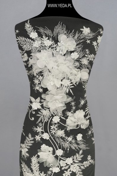 High-quality embellished lace with a unique pattern and decorative details. It was created for the most demanding women who want to achieve unique and effective styling. The presented lace will be perfect as a base for a wedding or evening creation. It owes its charm to the details on it. They reflect light and illuminate the material, and consequently catch the eye.
