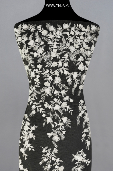 High-quality embellished lace with a unique pattern and decorative details. It was created for the most demanding women who want to achieve unique and effective styling. The presented lace will be perfect as a base for a wedding or evening creation. It owes its charm to the details on it. They reflect light and illuminate the material, and consequently catch the eye.