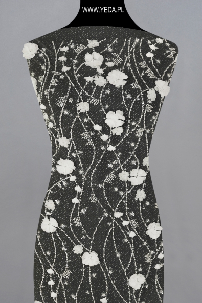 High-quality embellished lace with a unique pattern and decorative details. It was created for the most demanding women who want to achieve unique and effective styling. The presented lace will be perfect as a base for a wedding or evening creation. It owes its charm to the details on it. They reflect light and illuminate the material, and consequently catch the eye.