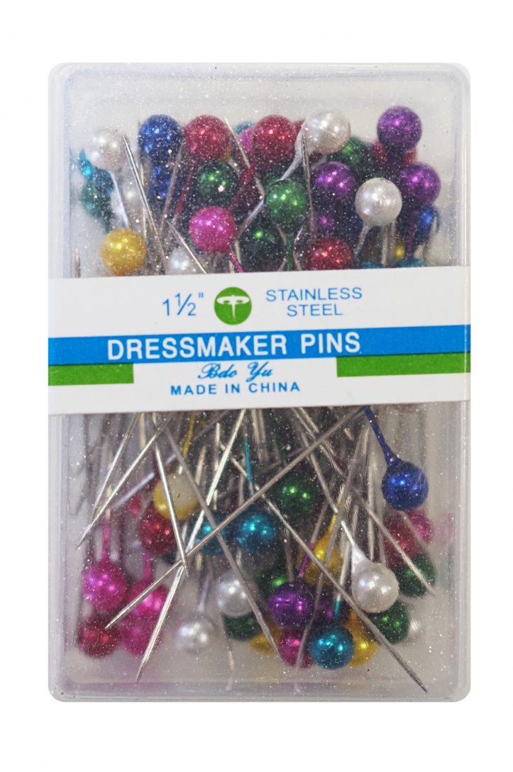 Standard steel pins with large toes. Packed in a reusable plastic box. Multicolored pins heads make the pins not only suitable for tailoring applications, but also as decoration accessories.