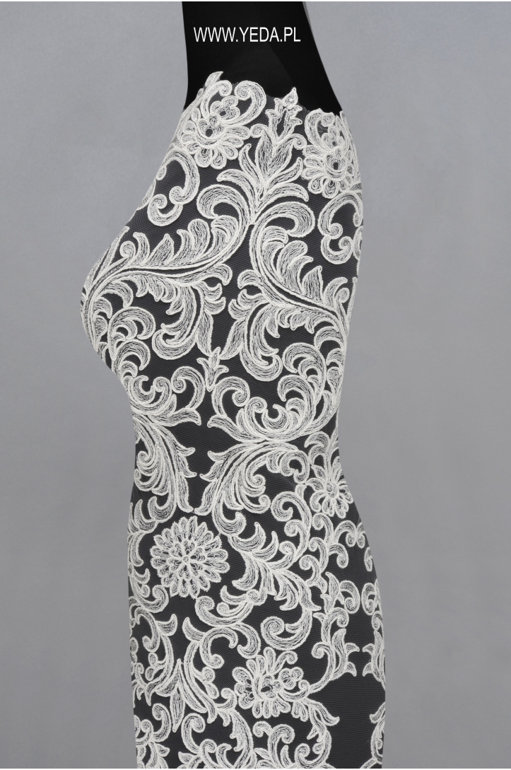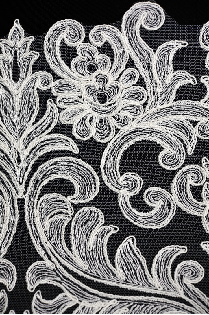 Feminine and elegant not embellished lace with the highest quality. The unique pattern makes this material ideally suited as a part of a cocktail, evening, or even wedding creation. The main aesthetic value of this product is just the mentioned pattern, because no additional decorations appear on the lace. This material is perfect for women who value classic style and subtle elegance.