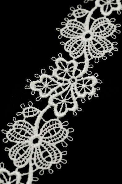The highest quality undecorated trim made of guipure. Perfect as a finishing element of both dresses and tablecloths, curtains or other textiles. The convex form and interesting lace pattern make the fabric gain a subtle decorative accent.