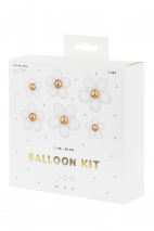 Zestaw balonów lateksowych Kwiaty, zestaw zawiera 6 balonów w kolorze złotym, 30 balony w kolorze białym oraz 4 kółka w rozmiarze 13 cm i 2 kółka w rozmiarze 11 cm do mocowania balonów. Wymiary kwiatów po złożeniu ok. 40 cm, 45 cm, 50 cm.