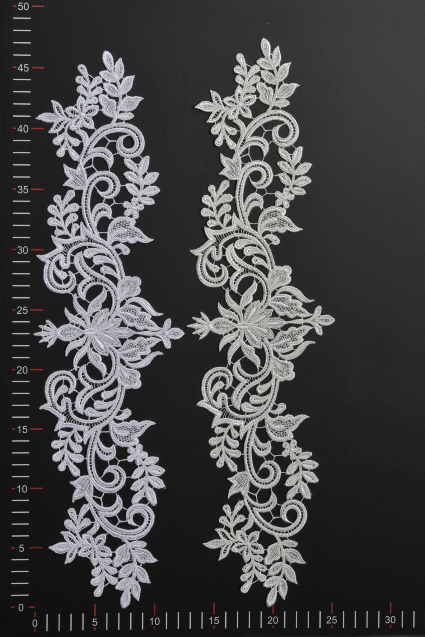 Wysokiej jakości aplikacja niezdobiona wykonana z gipiury. Wyróżnia się solidną formą, wyraźnym kształtem oraz szerokimi oczkami koronki. Naszyta na suknię ślubną, wieczorową czy koktajlową nadaje jej indywidualnego i niepowtarzalnego charakteru.
