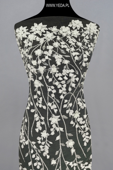 Wysokiej jakości koronka zdobiona wyróżniająca się niebanalnym wzorem oraz dekoracyjnymi detalami. Stworzona została z myślą o najbardziej wymagających kobietach, którym zależy na uzyskaniu wyjątkowej i efektownej stylizacji. Prezentowana koronka świetnie sprawdzi się jako baza ślubnej lub wieczorowej kreacji. Swój urok zawdzięcza znajdującym się na niej detalom. Odbijają one światło i rozświetlają materiał, a w konsekwencji przykuwają spojrzenia.