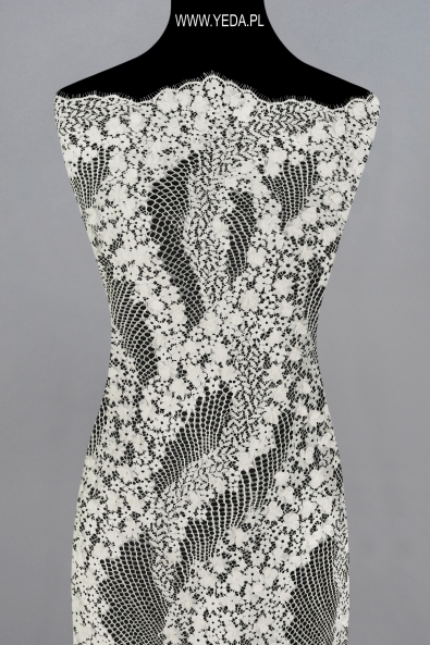 Kobieca i elegancka koronka niezdobiona wyróżniająca się najwyższą jakością wykonania. Wyjątkowy deseń sprawia, że materiał ten doskonale sprawdzi się jako część koktajlowej, wieczorowej, a nawet ślubnej kreacji. Głównym walorem estetycznym tego produktu jest właśnie wspomniany wzór, ponieważ na koronce nie pojawiają się żadne dodatkowe zdobienia. Ten materiał doskonale pasuje do kobiet, które cenią klasyczny styl i płynącą z niego subtelną elegancję.