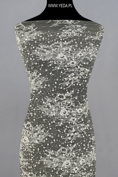 Wysokiej jakości koronka zdobiona wyróżniająca się niebanalnym wzorem oraz dekoracyjnymi detalami. Stworzona została z myślą o najbardziej wymagających kobietach, którym zależy na uzyskaniu wyjątkowej i efektownej stylizacji. Prezentowana koronka świetnie sprawdzi się jako baza ślubnej lub wieczorowej kreacji. Swój urok zawdzięcza znajdującym się na niej detalom. Odbijają one światło i rozświetlają materiał, a w konsekwencji przykuwają spojrzenia.