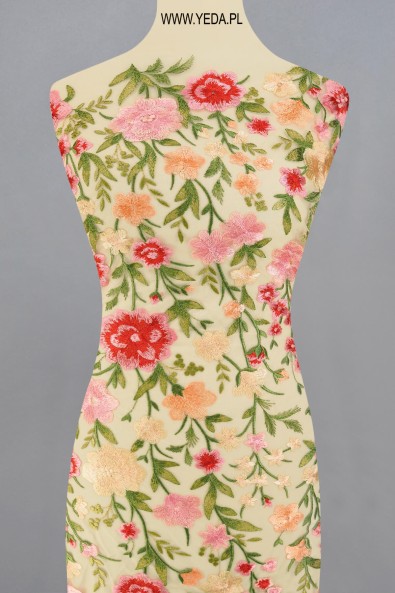 Koronka wieczorowa w odcieniu beżu z motywem kolorowych kwiatów to efektowna tkanina łącząca elegancję z subtelną nutą świeżości. Barwne, kwiatowe aplikacje pięknie ożywiają beżowe tło, nadając kreacjom unikalny i romantyczny charakter. Idealna na suknie wieczorowe, koktajlowe oraz dekoracyjne akcenty w wyjątkowych projektach.