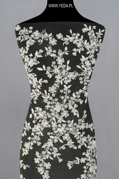 Wysokiej jakości koronka zdobiona wyróżniająca się niebanalnym wzorem oraz dekoracyjnymi detalami. Stworzona została z myślą o najbardziej wymagających kobietach, którym zależy na uzyskaniu wyjątkowej i efektownej stylizacji. Prezentowana koronka świetnie sprawdzi się jako baza ślubnej lub wieczorowej kreacji. Swój urok zawdzięcza znajdującym się na niej detalom. Odbijają one światło i rozświetlają materiał, a w konsekwencji przykuwają spojrzenia.