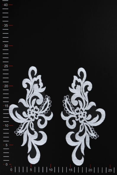 Wysokiej jakości aplikacja niezdobiona wykonana z gipiury. Wyróżnia się solidną formą, wyraźnym kształtem oraz szerokimi oczkami koronki. Naszyta na suknię ślubną, wieczorową czy koktajlową nadaje jej indywidualnego i niepowtarzalnego charakteru.